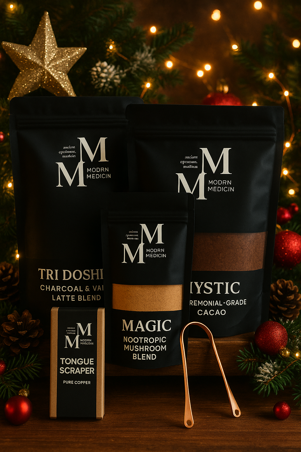 This luxury ritual bundle brings together our nootropic brain blend, ceremonial cacao, detoxifying tridoshic latte, and our pure copper tongue scraper — a full-spectrum ceremonial practice for your mind, heart, and energetic body.